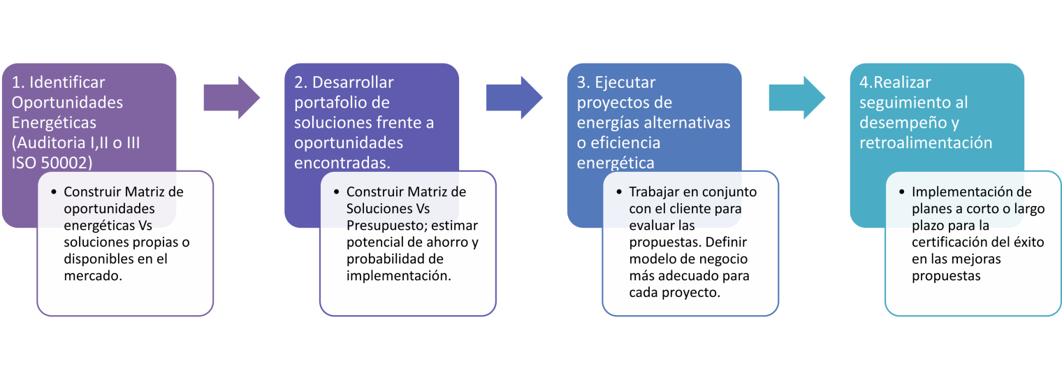 Nuestros servicios de eficiencia energética están basados en un sencillo y efectivo proceso de identificación de oportunidades de optimización, así como el planteamiento y ejecución de sus posibles soluciones. Cada una de las etapas se adaptan a las necesidades puntuales de cada cliente lo que permite tener una matriz de costos flexible para el cliente y acorde al nivel de madurez de cada organización. A continuación, una breve descripción de cada una de nuestras líneas de negocio.